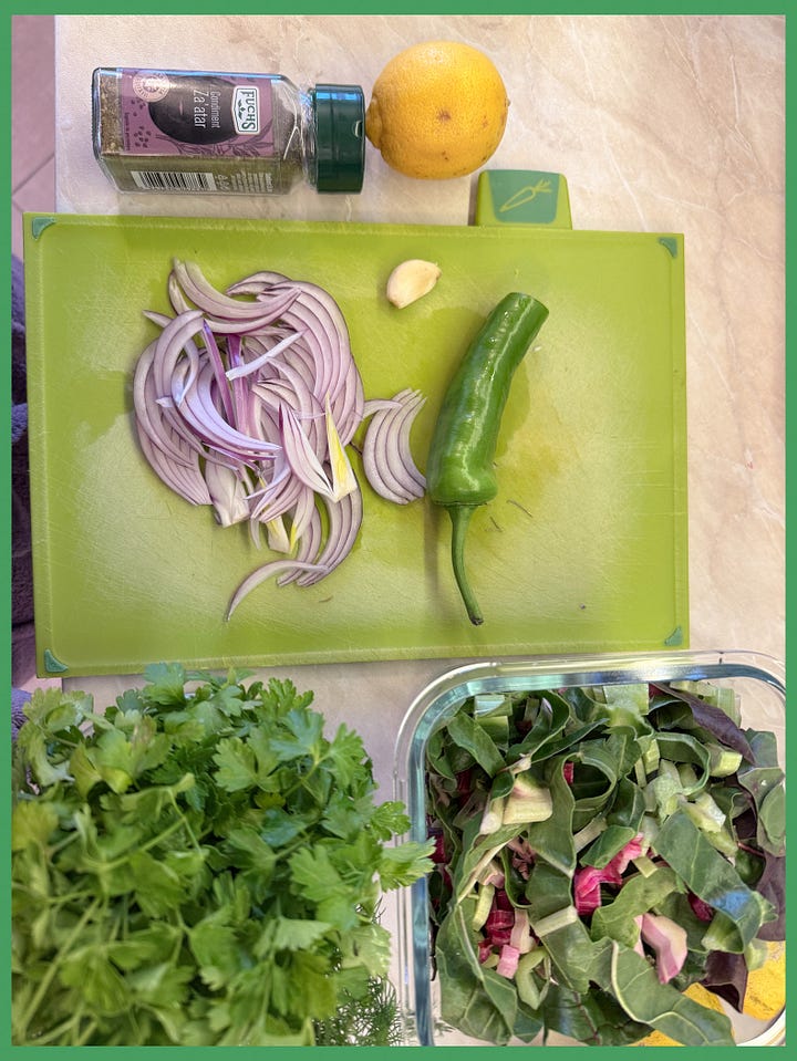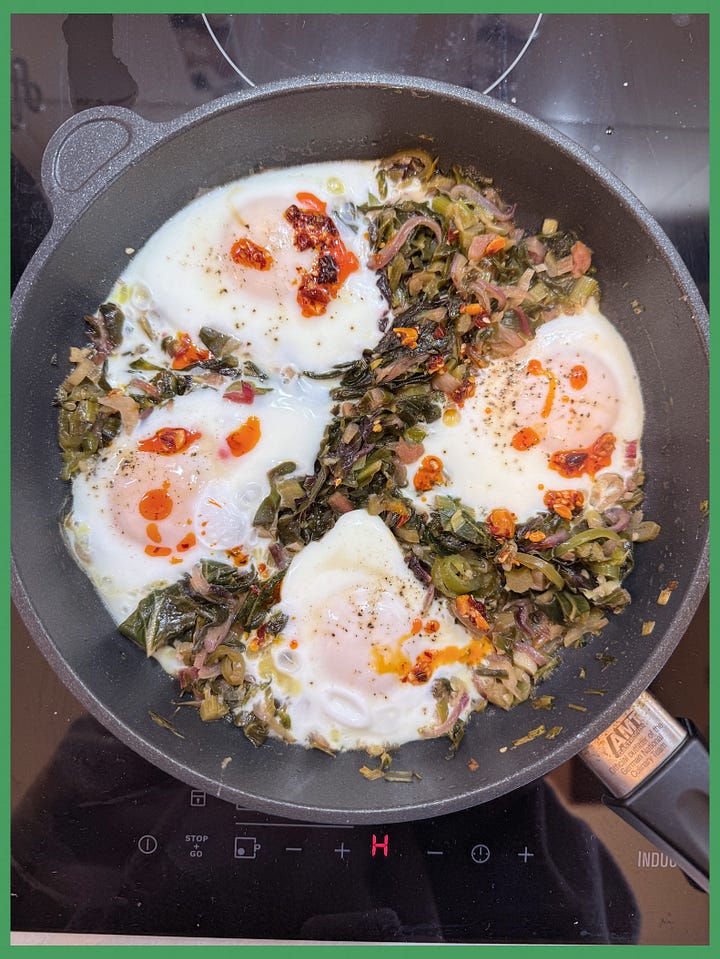 Feliez o ceapă mică roșie și o adaug într-o tigaie medie non-stick, preîncălzită cu 2 lg evoo și 1 lg de unt, până când se înmoaie ceapa. Adaug tulpinile de mangold (prepped) și trei cepe verzi tocate, amestec, pun capacul și las la gătit până când totul se înmoaie. Toc un cățel de usturoi, un ardei chilli verde, 1–2 lg de mărar și pătrunjel. Le adaug în tigaie cu ¼ lgt coriandru uscat (sau za’atar), 1 lg suc de lămâie, ½ lgt sare, 50 ml apă și 1–2 mâini de frunze de mangold tocate (prepped). Pun capacul și las la gătit până se înmoaie frunzele de mangold (vreo 10 min). Sparg 4 ouă și le adaug în tigaie cu sare și piper. Pun capacul până se gătește albușul și devine opac, vreo 4 min.