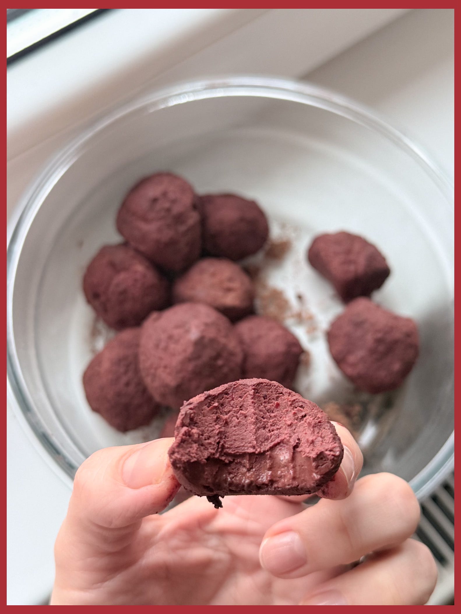 Într-o oală mică adaug 150g smântână pentru frișcă (ex. de la Lăptăria cu Caimac), 1 lg unt, 2 lg miere și le încălzesc până aproape de fierbere, amestecând constant. Adaug mixul obținut peste ciocolata din bol și amestec bine până obțin o cremă. Mixez 60–80g sfeclă roșie până devine o pastă și o adaug peste crema din bol. Pun capac și las la frigider până se întărește, vreo 3 ore. Formez biluțe din compoziție, le dau prin pudră de cacao și le păstrez în frigider până la 5 zile.