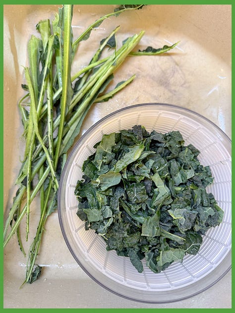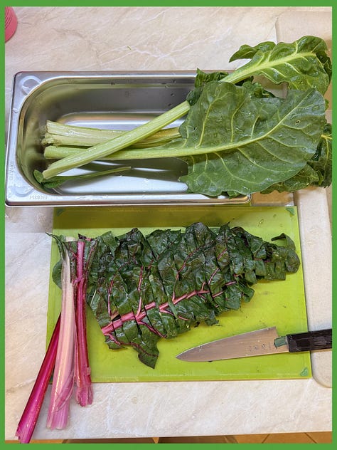 Tai frunzele în fâșii de un cm(ish), le spăl într-un uscător de salate în mai multe ape. Separat, tai tulpina în bucăți mici. Le spăl și usuc în același uscător.