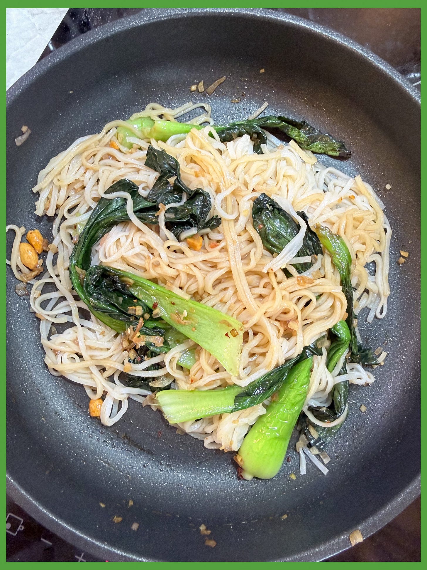 Fierb 100g noodles cf. instrucțiunilor de pe ambalaj. Tai o ceapă mică, rad un cățel de usturoi și un deget de ghimbir proaspăt (sau înlocuiesc cu un praf de ghimbir pudră). Le adaug într-o tigaie medie non-stick și le amestec cu o lg ulei de susan. Gătesc până se înmoaie ceapa. Spăl și adaug frunzele de pak choi și un strop de apă. După vreo 2 min, pun capacul și mai las la gătit un minut. Adaug o lgt sos de soia, o lgt ulei cu chilli, noodles fierți și amestec bine. Iau de pe foc. Separat, într-o tigaie mică non-stick, pun o lgt ulei cu chilli și două ouă la prăjit.
