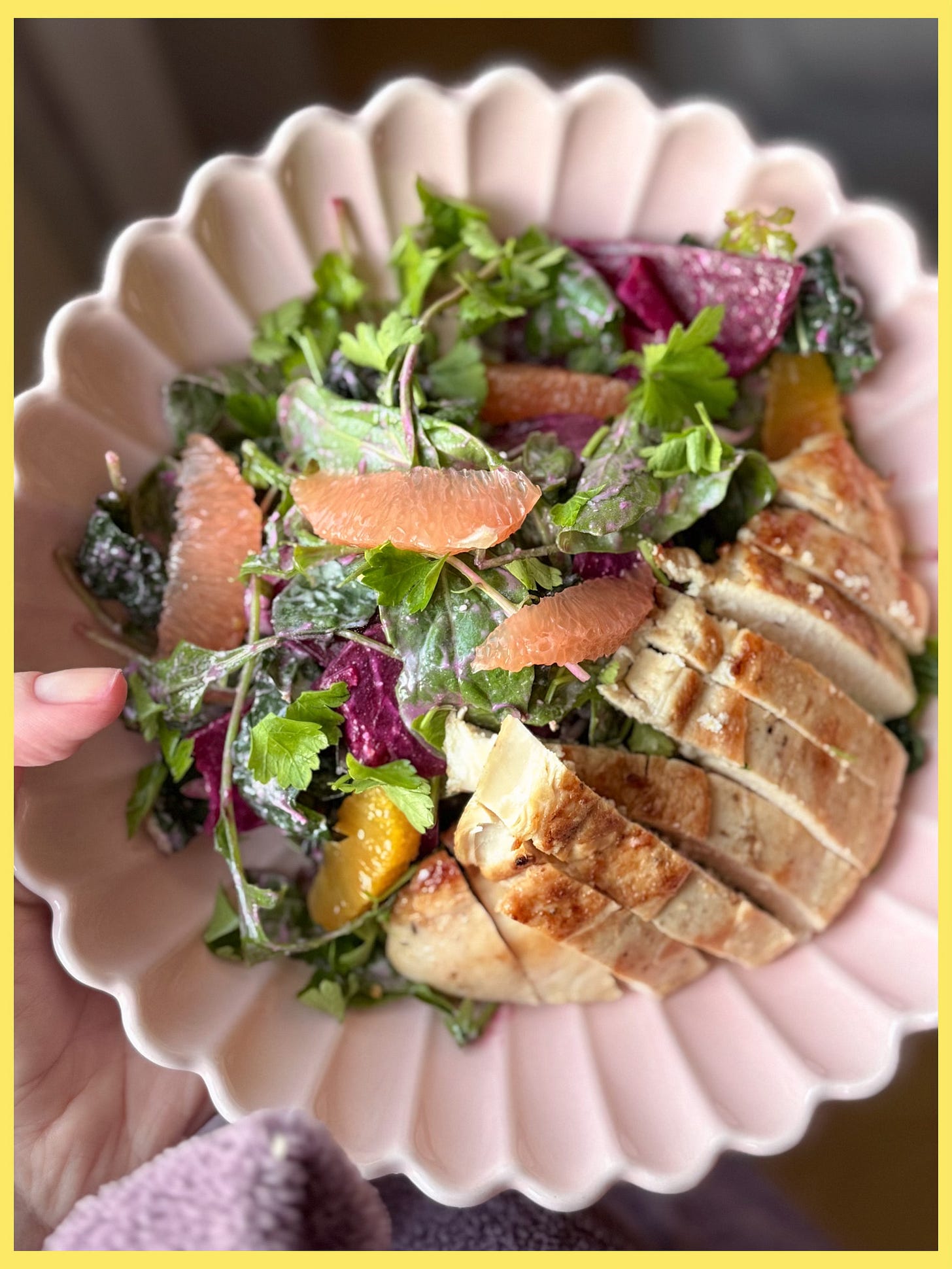 Salata. Pun într-un bol mediu: 2 mâini kale (prepped) + spăl și usuc 1 mână de rucola, tai felii 1–2 sfecle roșii (prepped) și 1 ceapă roșie mică, mărar și pătrunjel. Adaug puțină sare și puțin dressing și masez frunzele de kale până când se înmoaie. Adaug segmente de portocală și grapefruit (opțional), adaug mai mult dressing și amestec. Servesc cu pieptul de pui tăiat fâșii, avocado și fistic tocat (opțional).
